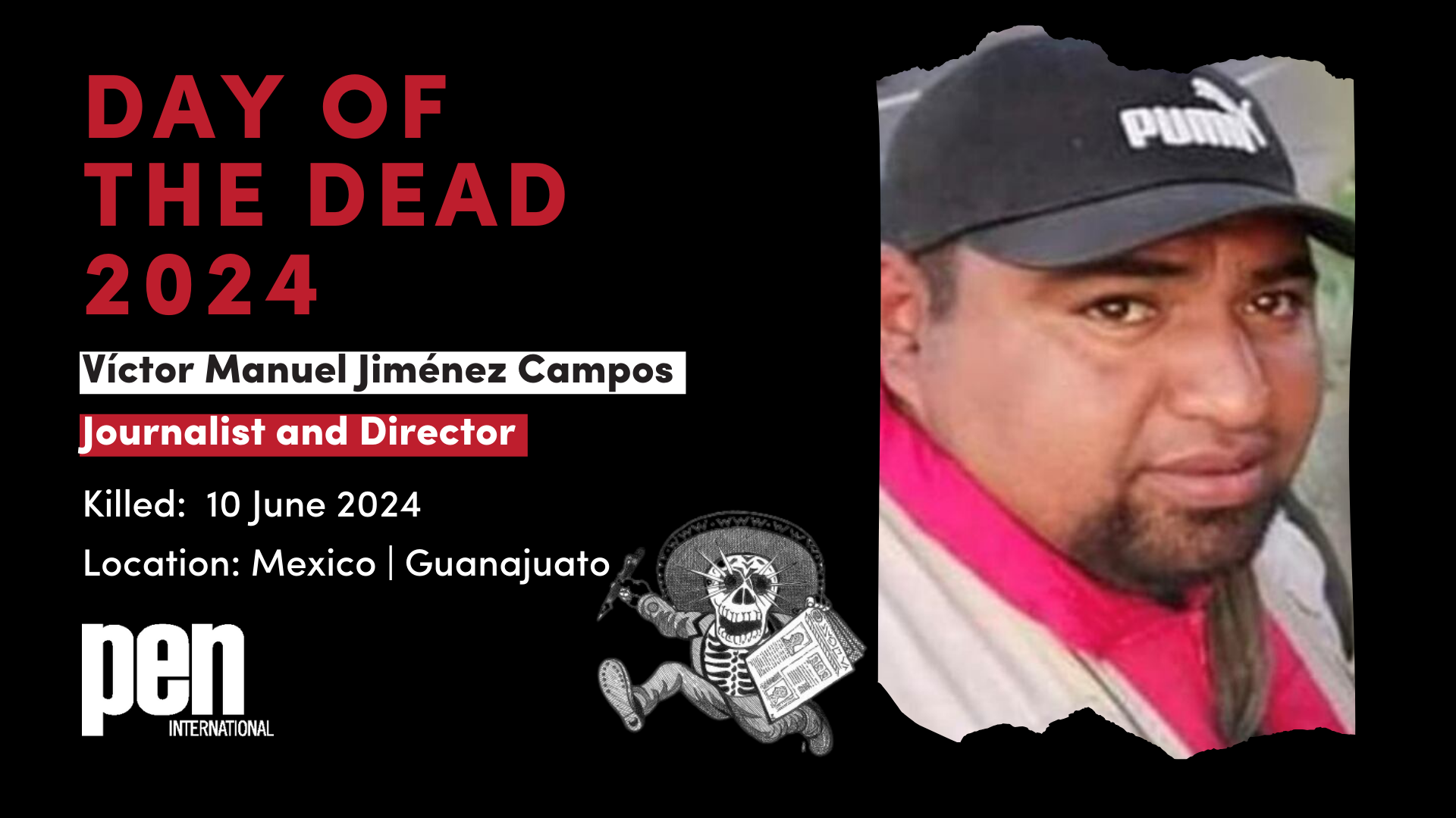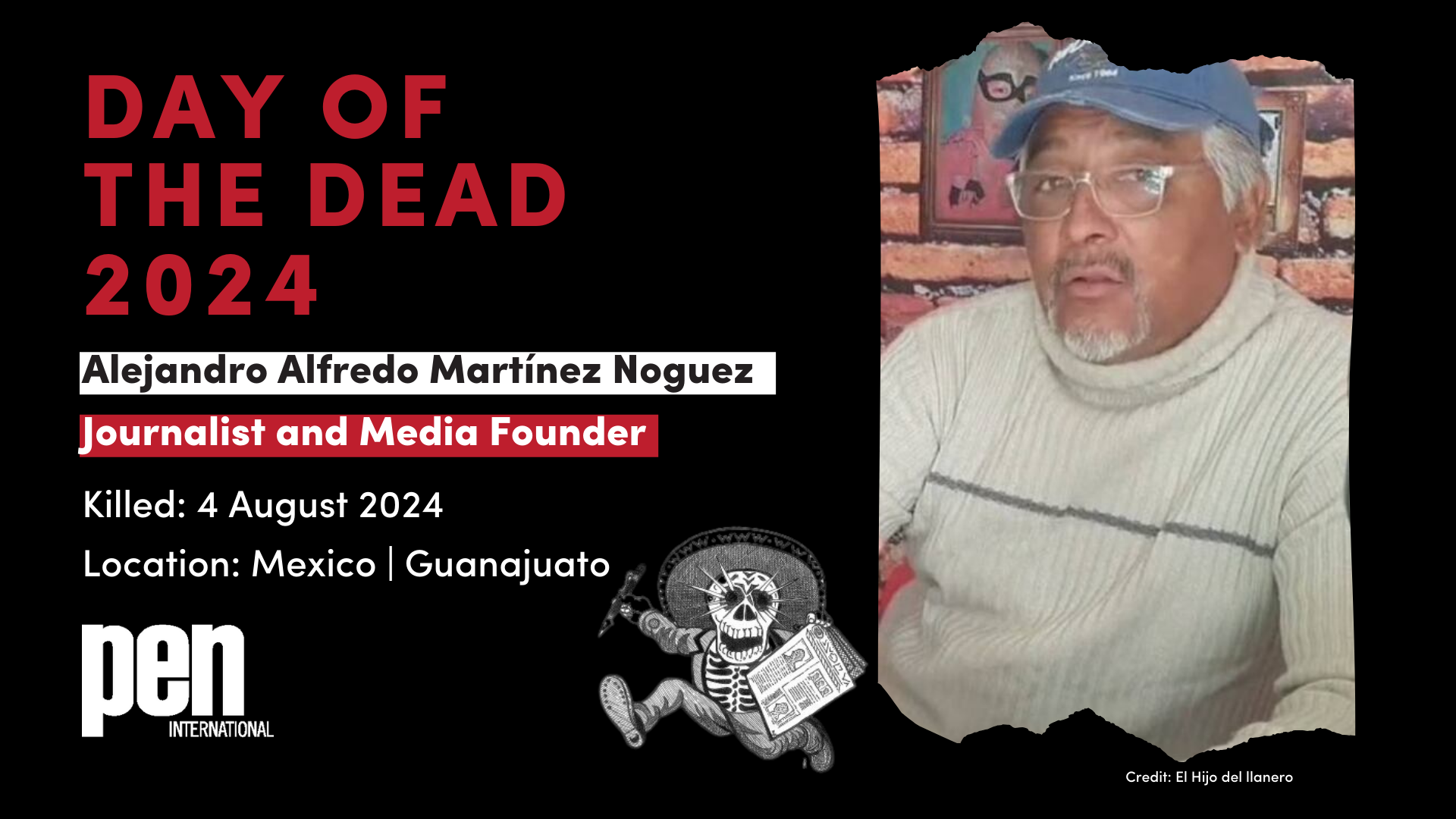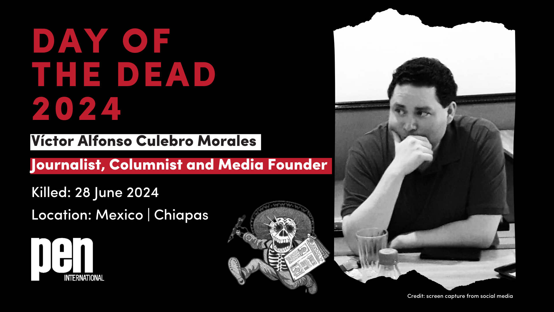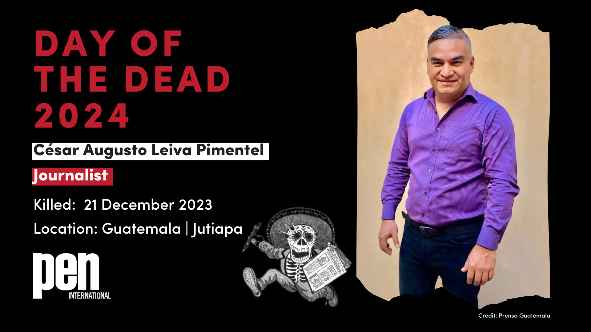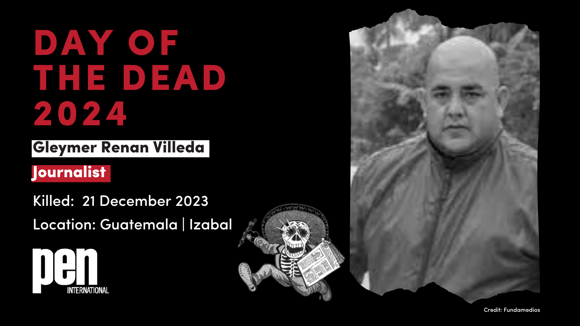 PEN members, writers, journalists and other interested parties are invited to take action on or around the Day of the Dead - between 31 October and 13 November 2024, urging the governments of Mexico, Honduras, Colombia and Guatemala to make substantive progress in investigating journalist murders, and raising awareness about their killing, in connection to their work.